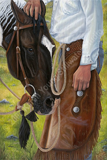 Details: Inspiration provided by my wonderful paint, Marty. The rider's name is Tater, an Assiniboine Sioux. Authentic Tack was made by the tribal elders and Tater. After the photo shoot, Marty just looked like he was...tater'd out.